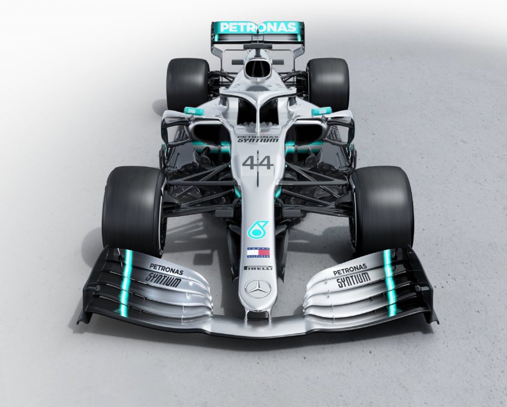 Mercedes stick with a black arrow for one more season, but have removed the sea of stars that adorned the rear of the engine cover on the last two cars. They have, in fact, been replaced by a sea of AMGs…