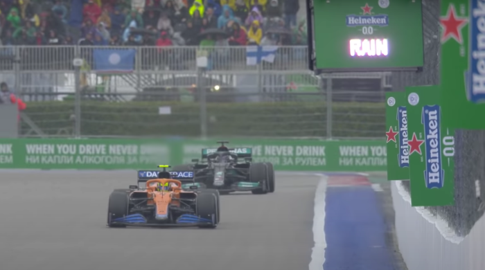 By lap 47 of 53, the parts of the track closest to the Black Sea were significantly wet. Norris had a moment of oversteer and ran wide, but a cautious Hamilton – with one eye on the championship battle – remained narrowly behind.